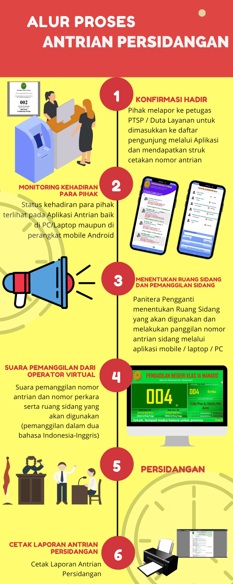 Pengunjung sidang yang telah melakukan konfirmasi hadir, juga akan mendapatkan struk nomor antrian dari Mesin Anjungan Mandiri oleh karena itu, para pihak dapat menunggu pada ruang tunggu dengan tenang dan sehingga tanpa harus khawatir tidak terlayani.