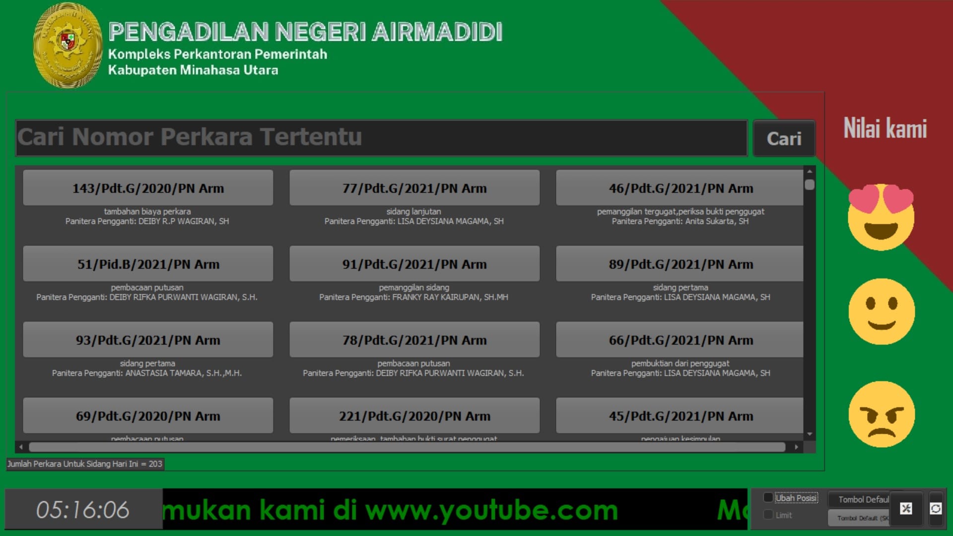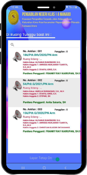 - Aplikasi memanggil dengan menyebutkan nomor antrian dan nomor perkara yang akan bersidang
