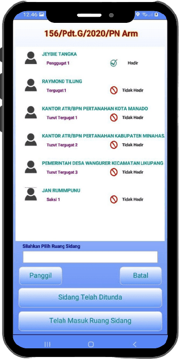 Pada modul android, tersedia informasi para pihak yang telah hadir dan yang belum melakukan konfirmasi hadir untuk setiap perkara yang akan disidangkan.