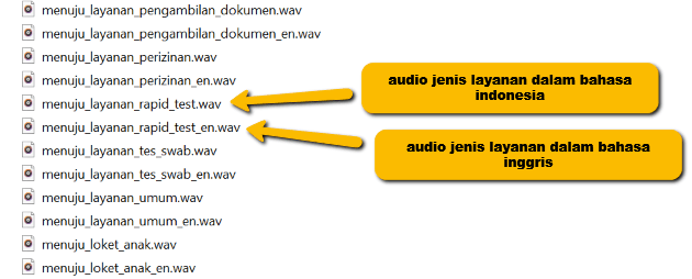 - Harus dengan tipe ekstensi *.wav dan mengaturnya sesuai dengan nama jenis layanan.