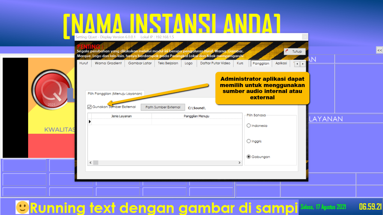 - Untuk pemanggilan QDisplay dengan menggunakan file audio external, administrator perlu memastikan bahwa Aplikasi QDisplay berjalan pada PC yg telah menyimpan file audio eksternal.