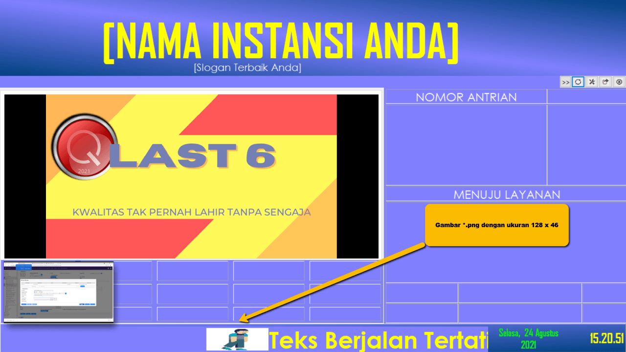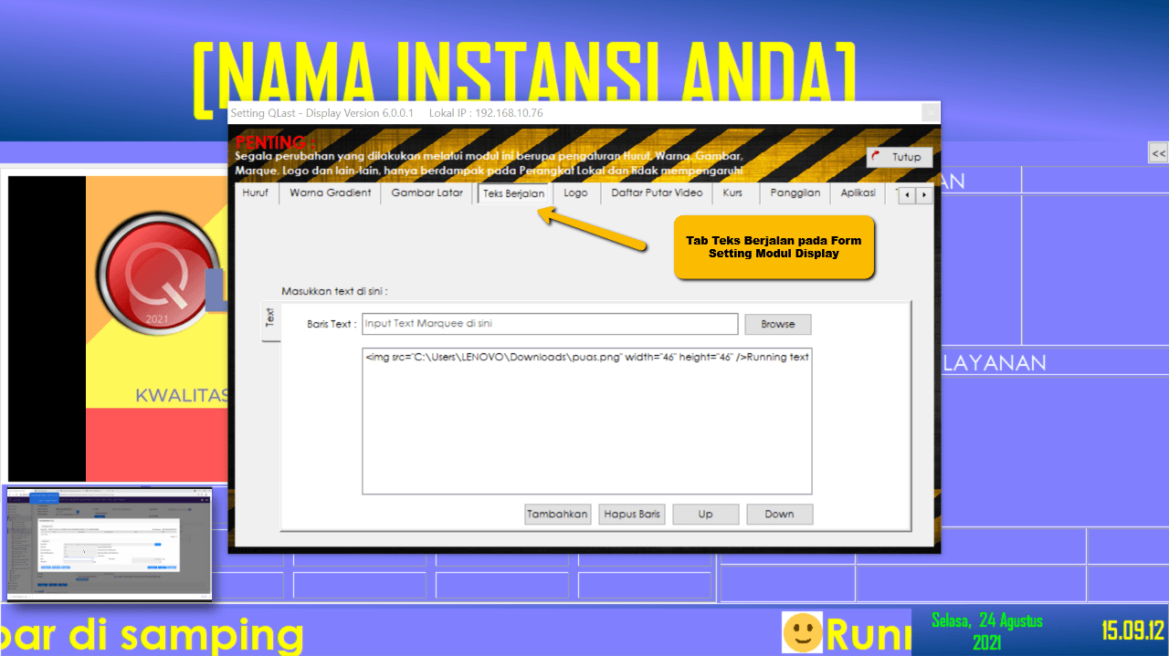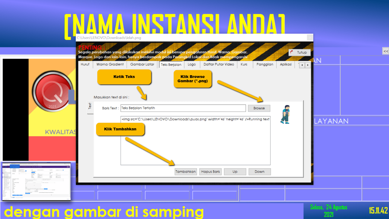 Administrator dapat mengatur Running text pada PC Tampilan LCD TV, dengan menambahkan gambar agar lebih informatif.